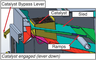 When the catalyst is bypassed, the sled slides back, out of the way. As soon as the bypass lever is lifted, the rear of the sled rides up on two ramps, and the front is elevated by the control linkage. Elevating the sled when the catalyst is not fully engaged prevents abrasion on the sealing gasket (not shown).