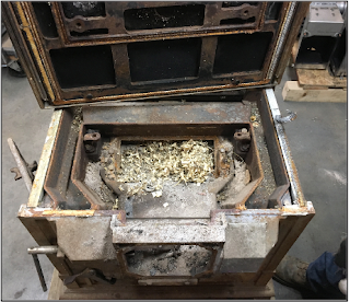 The combustor pan was then installed into the top stove cavity, and the catalytic combustor fitted to it. Finally, the rebuilt stove top was placed onto the stove and the final touch-ups were completed.