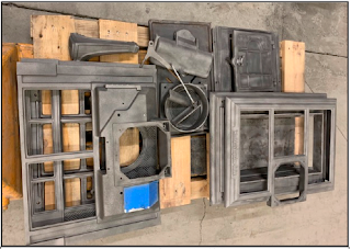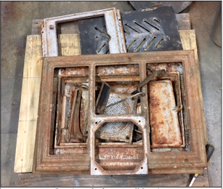 With the occupant evicted, the mouse nest was removed and the stove fully disassembled. All of the reusable soapstone slabs were set aside on a pallet to be sanded, and all the cast iron components were sandblasted and then painted. The internal components were painted black, and the exterior castings for this stove were painted Metallic Gray (the original color).