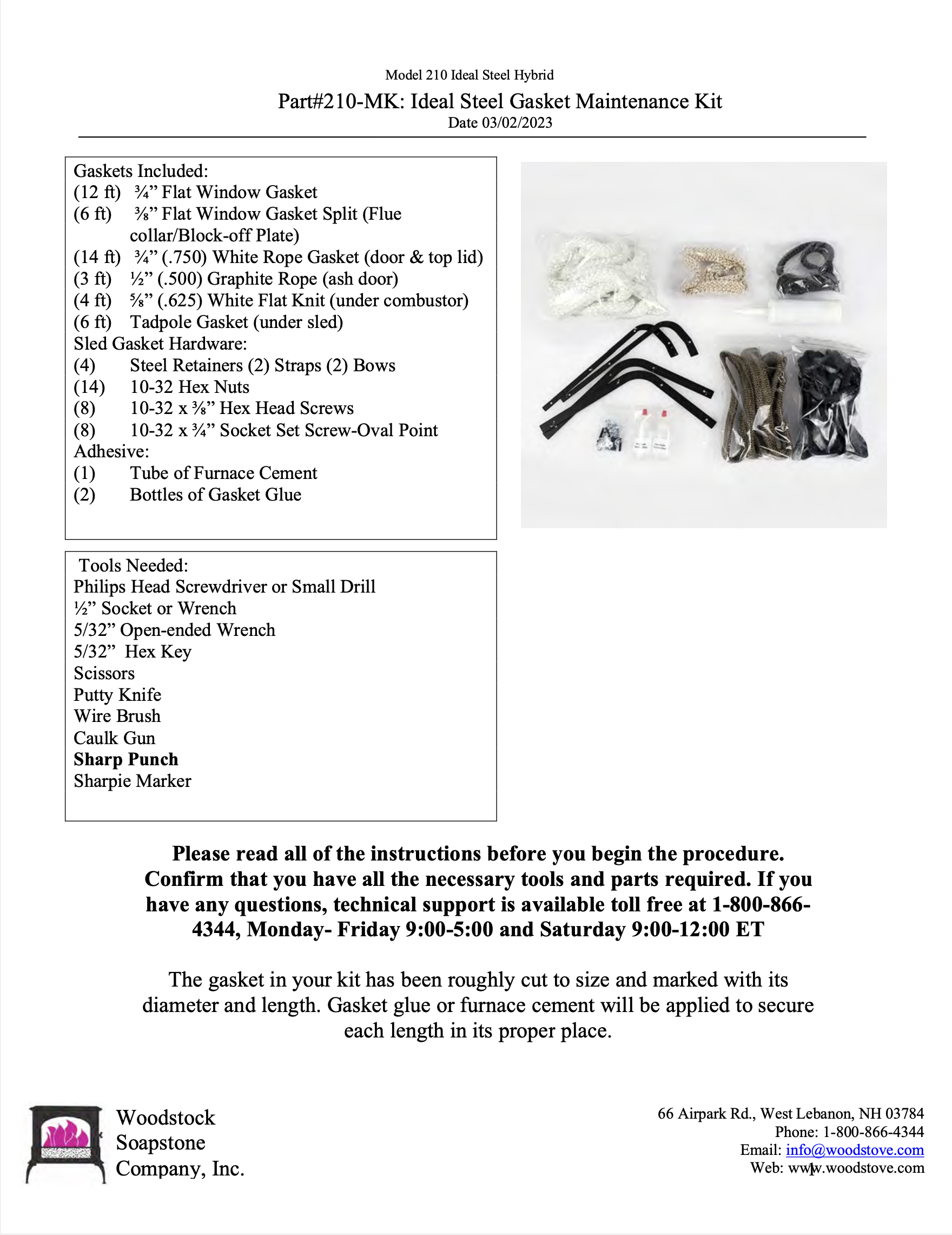 The Ideal Steel Maintence Kit includes gaskets for the Top Lid, Flue Collar & Block-off Plate, Under the Catalytic Combustor, Sled (includes the steel retainers and hardware), Loading Door, Window, and Ash Door. The kit also includes two bottles of gasket glue and a small tube of furnace cement.