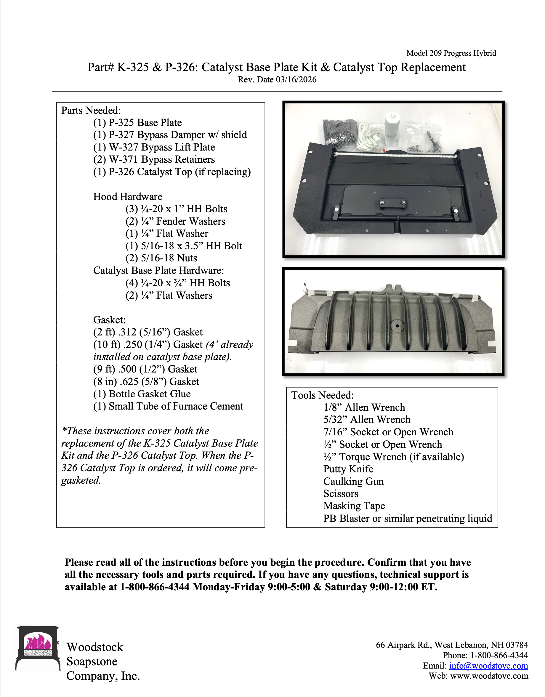 The Progress Hybrid Model 209/209a/209b catalyst base plate kit includes the P-325 base plate casting, bypass cover assembly and hardware, gaskets and adhesives needed for installation.